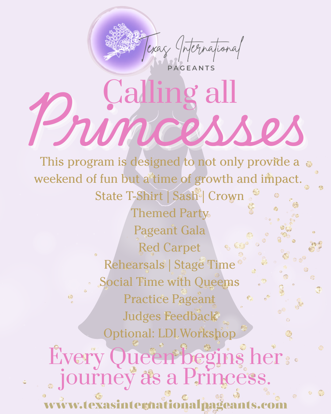 Start your journey today and experience the sisterhood of Texas International Pageants! With four age divisions and a commitment to fostering a positive, growth-filled experience for young and married women across the state, we’re excited to provide a premier pageantry experience.